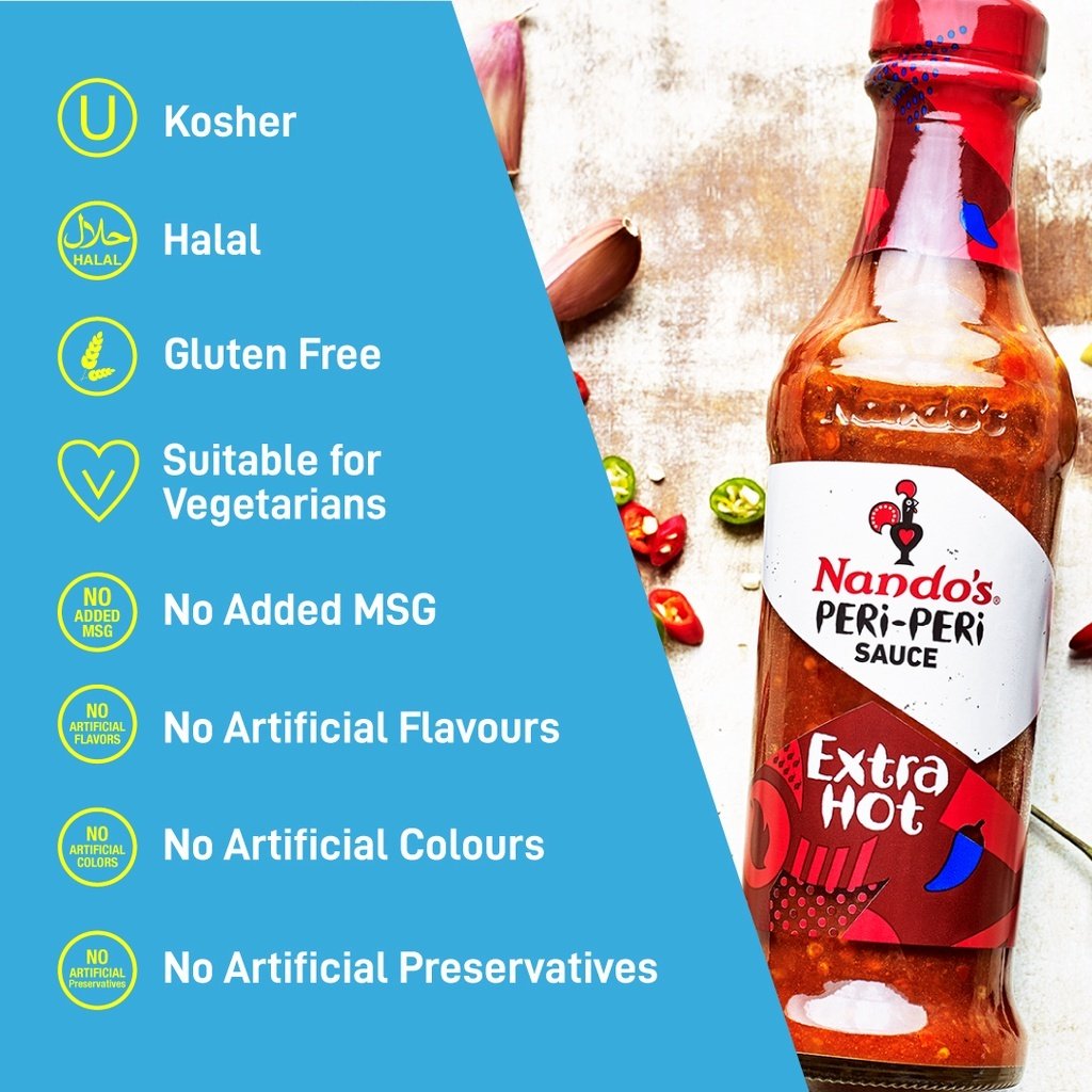 •Free from Nasties: Our PERi-PERi Sauces contain no added MSG, no artificial preservatives, artificial colours and no artificial flavours. They are also suitable for vegetarians and are both Kosher and Halal certified as well as gluten-free.